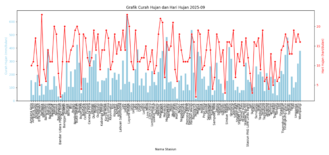 Selama periode bulan September 2025, kondisi curah hujan dan jumlah hari hujan di wilayah Sulawesi Tengah menunjukkan variasi spasial yang cukup besar berdasarkan data dari 130 stasiun pengamatan. Sebagian wilayah mengalami intensitas hujan tinggi, sementara sebagian lainnya relatif kering dengan frekuensi hujan yang rendah.
