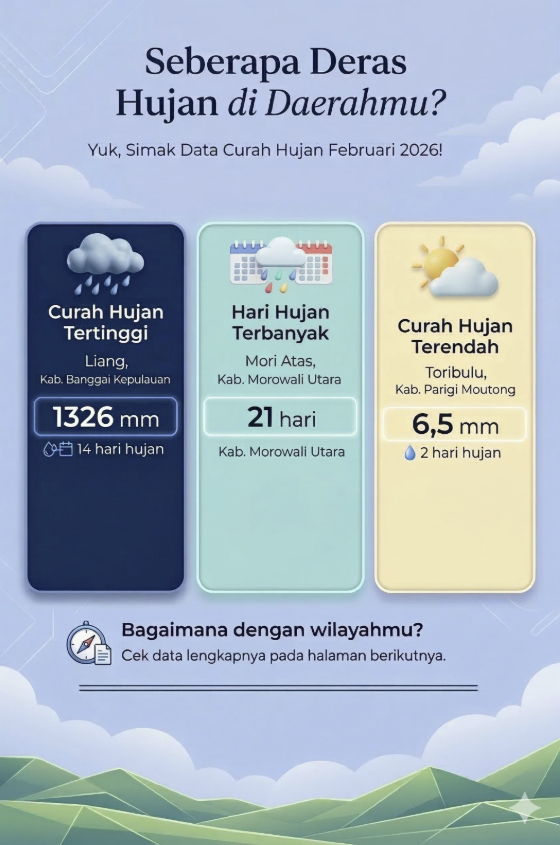 Sementara itu, jumlah hari hujan paling sedikit tercatat di Pembuni (Kabupaten Parigi Moutong) dengan hanya 1 hari hujan selama Februari 2026 dengan total curah hujan sebesar 15 mm.