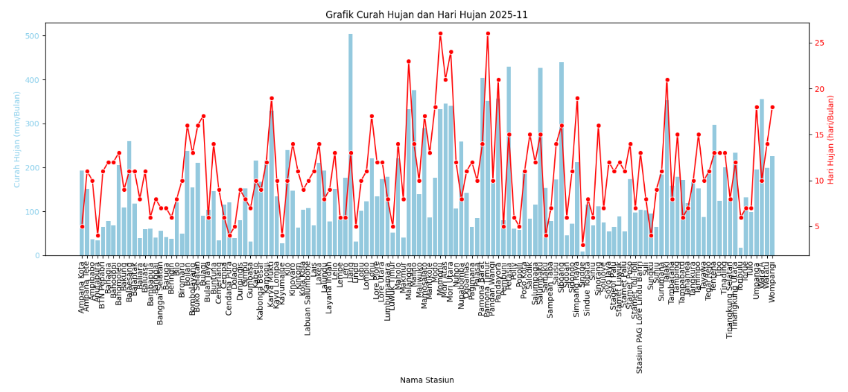 Stasiun yang mencatat curah hujan tertinggi pada November 2025 adalah Liang (Kabupaten Banggai Kepulauan) dengan akumulasi curah hujan sebesar 504,2 mm. Nilai ini termasuk dalam kategori sangat tinggi, mencerminkan intensitas hujan yang lebat dan berpotensi menimbulkan dampak hidrometeorologi seperti genangan, banjir lokal, atau tanah longsor di wilayah dengan topografi curam.