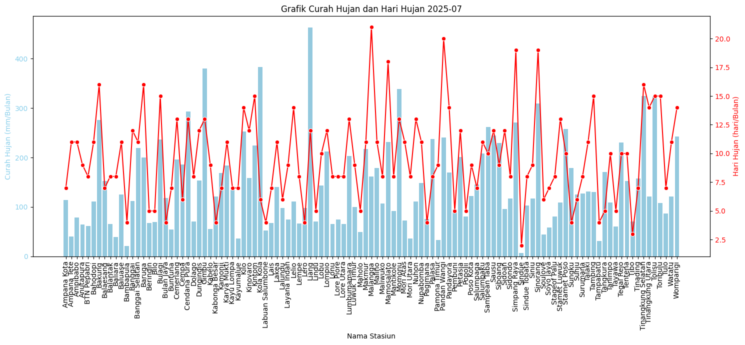 Selama periode bulan Juni 2025, kondisi curah hujan dan jumlah hari hujan di wilayah Sulawesi Tengah menunjukkan variasi spasial yang cukup besar berdasarkan data dari 122 stasiun pengamatan. Beberapa wilayah mengalami intensitas hujan yang sangat tinggi, sementara lainnya cenderung kering dengan frekuensi hujan yang rendah.