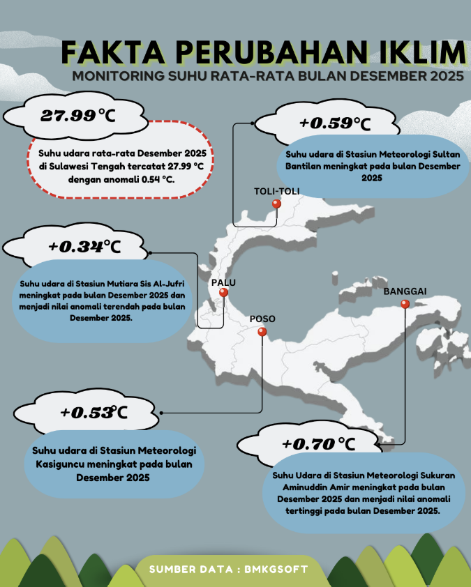 Monitoring suhu rata-rata bulan Desember 2025 di Provinsi Sulawesi Tengah menunjukkan adanya variasi anomali suhu di beberapa stasiun pengamatan. Suhu rata-rata wilayah tercatat sebesar 27.99°C dengan anomali sebesar 0.54°C dibandingkan nilai klimatologisnya.