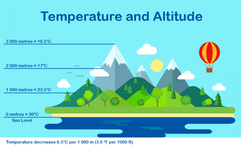 Semakin tinggi suatu wilayah dari permukaan laut, suhu udara akan semakin rendah. Secara umum suhu udara menurun sekitar 0,6°C setiap kenaikan 100 meter. Daerah pegunungan biasanya memiliki suhu lebih sejuk dibandingkan dataran rendah.