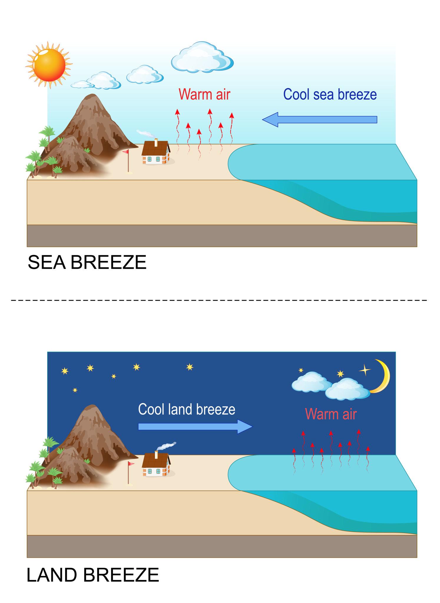 Wilayah yang dekat dengan laut biasanya memiliki suhu lebih stabil dan kelembapan lebih tinggi dibandingkan wilayah yang jauh dari laut. Laut berperan sebagai penyimpan panas dan sumber uap air yang memengaruhi pembentukan awan dan hujan. Wilayah pesisir biasanya memiliki variasi suhu yang lebih kecil dibandingkan wilayah daratan.