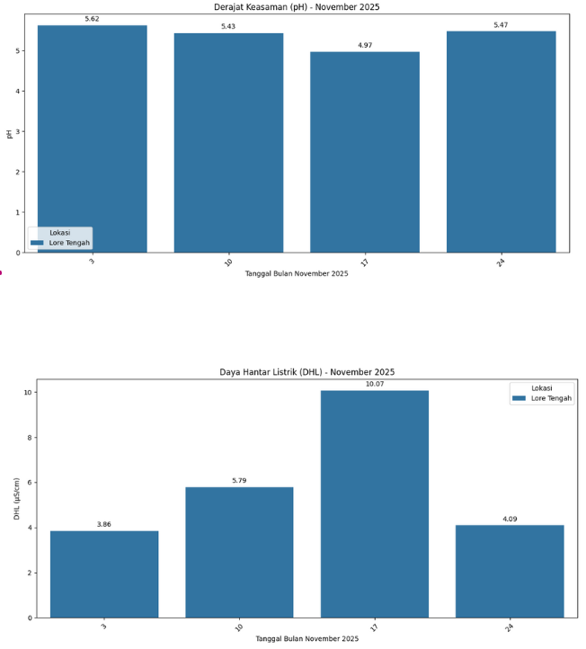 Berdasarkan hasil analisis laboratorium BMKG, air hujan di wilayah Lore Tengah (GAW Bariri) pada bulan November 2025 menunjukkan nilai pH harian berkisar antara 4,97 hingga 5,62, dengan rata-rata sebesar 5,37. Nilai ini berada dalam rentang hujan asam menurut standar BMKG (pH 4,1–5,5). Sementara itu, hasil pengukuran daya hantar listrik (DHL) pada periode yang sama menunjukkan variasi antara 3,86 hingga 10,07 µS/cm, yang mencerminkan perbedaan kandungan ion terlarut pada tiap minggu pengambilan sampel.. Sementara itu, untuk wilayah Kota Palu tidak dapat dilakukan analisis karena curah hujan pada bulan November sangat rendah sehingga sampel tidak mencukupi untuk dilakukan pengujian. Dengan demikian, air hujan di Lore Tengah pada November 2025 tergolong asam berdasarkan hasil pengukuran yang tersedia.