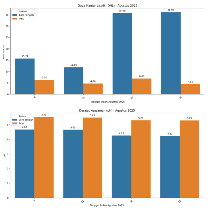 Berdasarkan hasil analisis laboratorium BMKG, air hujan di Kota Palu pada bulan Agustus 2025 memiliki tingkat keasaman (pH) dengan nilai rata-rata sebesar 5.39, yang menunjukkan air hujan asam. Selain itu, daya hantar listrik (DHL) rata-rata di wilayah ini mencapai 5.58 µs/cm. Sementara itu, air hujan di wilayah Lore Tengah (GAW Bariri) memiliki pH rata-rata 4.45, yang termasuk dalam kategori air hujan asam. Daya hantar listrik di wilayah ini yaitu sebesar 24.84 µs/cm. Menurut BMKG, hujan asam memiliki rentang pH antara 4.1 – 5.5. Dengan demikian, air hujan di Kota Palu tergolong normal sedangkan di Lore Tengah tergolong asam.