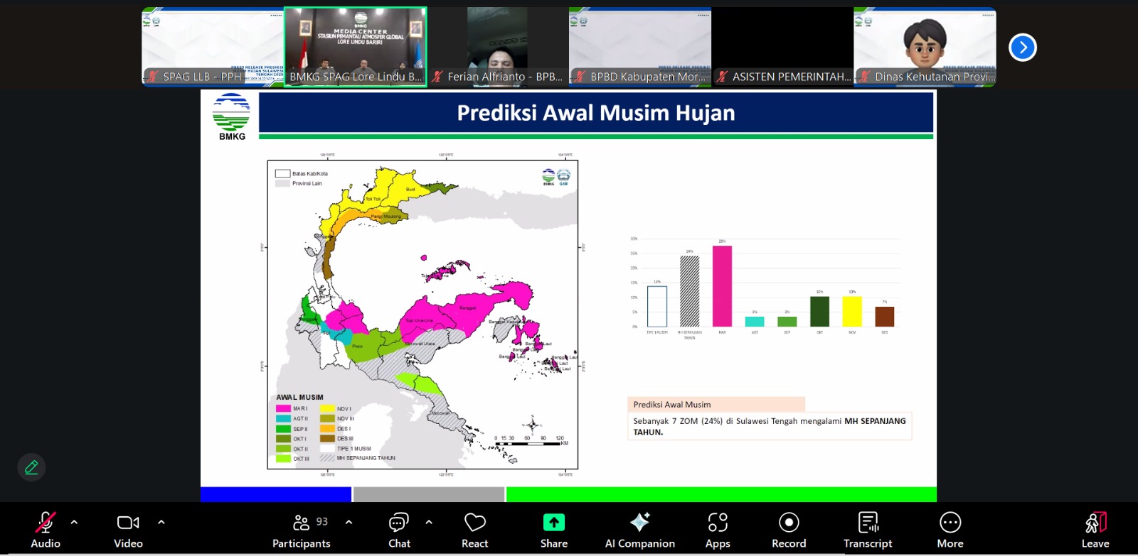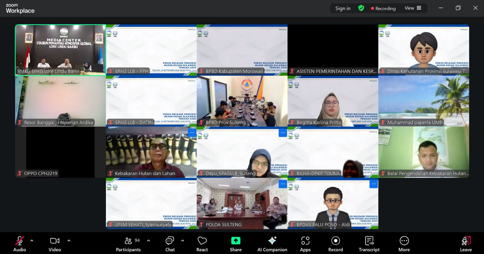 Palu, 16 September 2025 - Badan Meteorologi, Klimatologi, dan Geofisika (BMKG) melalui Stasiun Pemantau Atmosfer Global (SPAG) Lore Lindu Bariri telah melaksanakan kegiatan Press Release terkait Prediksi Musim Hujan 2025/2026 untuk wilayah Sulawesi Tengah. Acara ini berlangsung secara virtual pada Selasa, 16 September 2025 pukul 14.00 WITA melalui aplikasi Zoom.