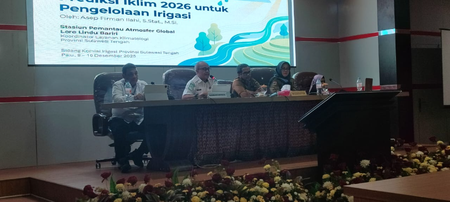 Palu, 9–10 Desember 2025 – Badan Meteorologi, Klimatologi, dan Geofisika (BMKG) melalui Stasiun Pemantauan Atmosfer Global (GAW) Lore Lindu Bariri ikut berpartisipasi dalam Sidang Komisi Irigasi Provinsi Sulawesi Tengah Tahun 2025 yang digelar di Kantor Bappeda Provinsi Sulawesi Tengah, Palu. Kehadiran BMKG menegaskan bahwa pengelolaan irigasi dan ketahanan pangan tidak dapat dipisahkan dari informasi iklim yang akurat dan terkini.
