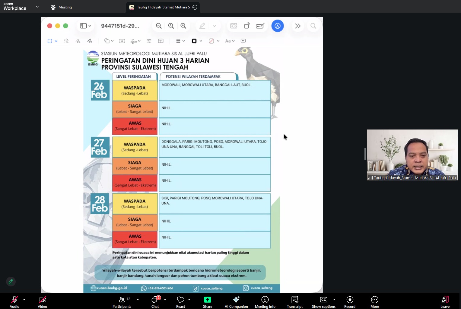 Sisi cuaca harian disampaikan Kepala Stasiun Meteorologi Mutiara Sis Al Jufri Palu, Taufiq Hidayah. Ia menyoroti prakiraan hingga sepekan ke depan yang masih didominasi cerah hingga berawan di banyak kecamatan, dengan peluang hujan yang terbatas. Suhu juga diperkirakan berada pada kisaran 24–32°C, kondisi yang dapat mempercepat pengeringan bahan bakar permukaan ketika hujan tidak merata. Stamet Mutiara turut memaparkan indikator Fire Danger Rating System (FDRS). Hasil pemantauan dan prediksi menunjukkan sinyal kondisi “kering sekali” hingga awal Maret. Karena itu, potensi kejadian karhutla dinilai masih mungkin muncul di beberapa area, terutama bila ada sumber api di lapangan.
